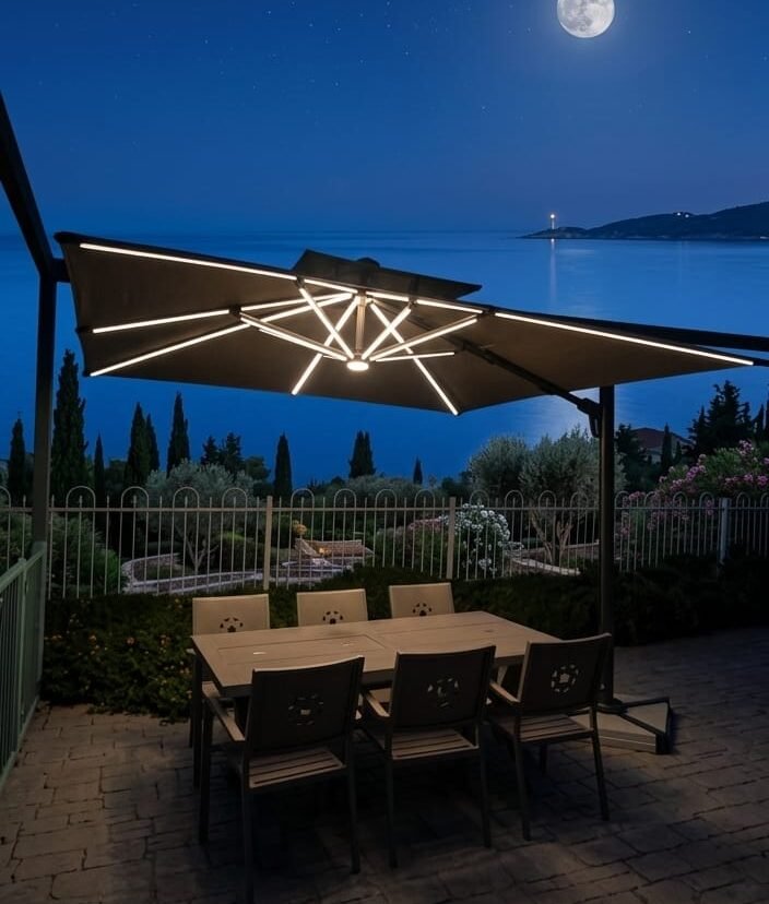 המערכת כוללת תאורת LED סולארית מובנית בצלעות השמשייה עם אפשרות טעינה גם דרך חשמל, כולל החלפת צבעים ליצירת אווירה מושלמת בשעות הערב.